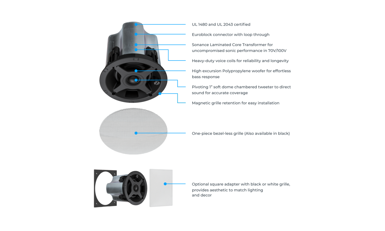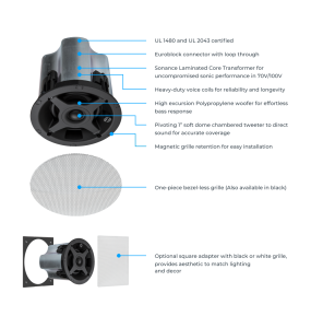 Il diffusore da incasso a soffitto a basso profilo Sonance PS-C43RTLP è progettato per spazi ristretti, adattandosi perfettamente sotto i condotti HVAC o nelle cavità con montanti da 2'x4'. Il suo design sottile (solo 87,12 mm) presenta una griglia senza cornice (bezel-less) fissata magneticamente per una facile verniciatura. Dotato di un woofer da 4" (100 mm) e un tweeter orientabile da 1", offre prestazioni audio eccezionali.