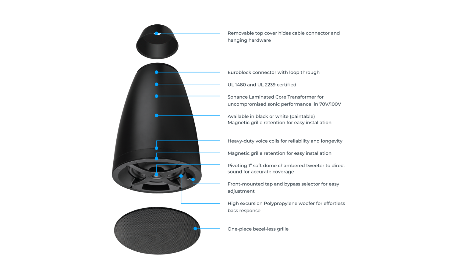 Il diffusore a sospensione (pendente) Sonance PS-P43T della Professional Series presenta un design elegante ispirato all'illuminazione, con una griglia monopezzo per un'estetica omogenea. La copertura superiore nasconde l'hardware di montaggio e il cablaggio. È dotato di un woofer da 4" (100 mm) ad alta escursione e di un tweeter orientabile da 1", assicurando un suono preciso e accurato. Le certificazioni UL 1480 e UL 2239 ne garantiscono la sicurezza e l'affidabilità professionale.