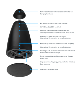 Il diffusore a sospensione (pendente) Sonance PS-P63T della Professional Series presenta un design elegante ispirato all'illuminazione, con una griglia monopezzo che garantisce un'estetica omogenea. La copertura superiore integrata nasconde l'hardware di montaggio e il cablaggio. È dotato di un woofer da 6.5" (165 mm) ad alta escursione e di un tweeter orientabile da 1", che assicura un suono preciso e di alta qualità. Le certificazioni UL 1480 e UL 2239 ne garantiscono la sicurezza e l'affidabilità professionale.
