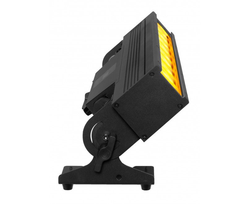 Grado di protezione IP65 per utilizzi indoor/outdoor, angolo di inclinazione di 180° e controllo DMX cablato con pin a 3 poli, DMX wireless + IR con pannello touch e programmi integrati (statici, automatici, fade e sound).