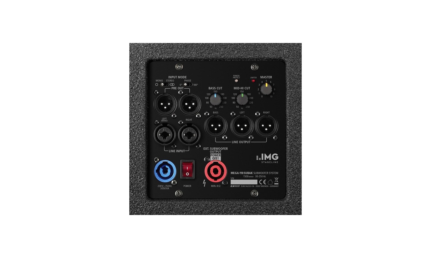 - uscite XLR Line L/R supplementari con filtro passa-alto (50-250 Hz) per altoparlanti supplementari attivi e uscita XLR Line con filtro passa-basso per un ulteriore subwoofer attivo