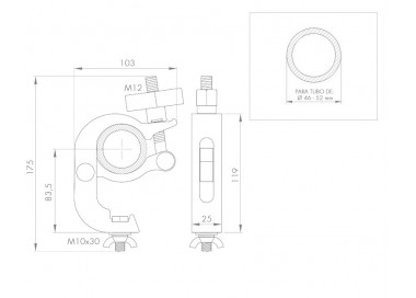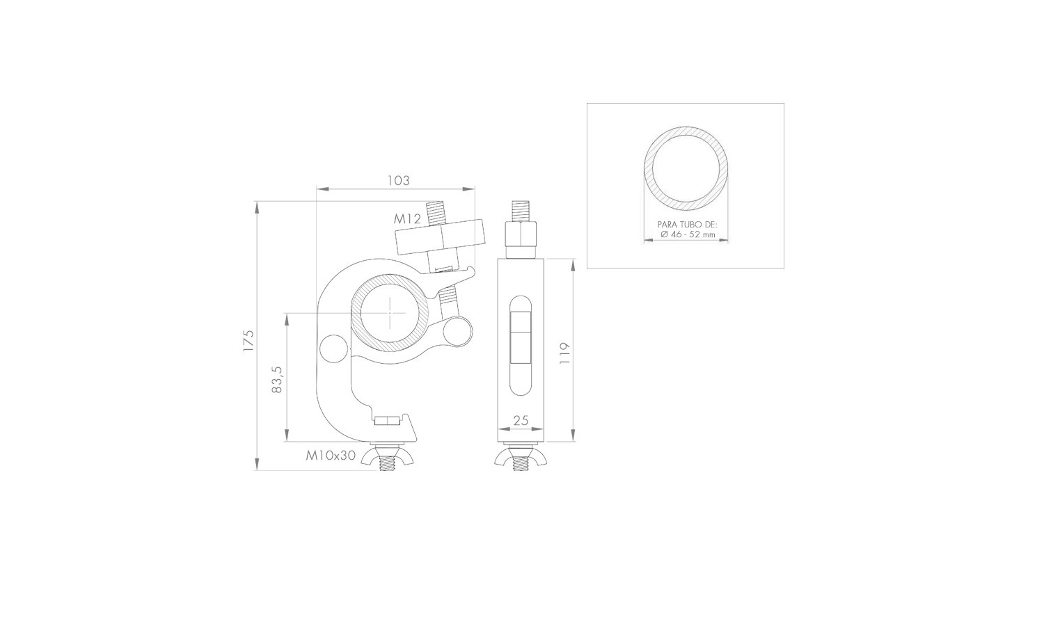 Clamp in alluminio con bloccaggio automatico. Include vite e dado a farfalla per il fissaggio di fari, apparecchiature elettroniche e altri dispositivi. Progettato per un fissaggio sicuro a tralicci/tubi con diametro esterno da 46 mm a 52 mm. Si distingue per le dimensioni più strette rispetto al clamp rif. ABZ-50/N, il che lo rende più adatto per installazioni in cui lo spazio di ancoraggio è ridotto (come nel caso di tralicci di dimensioni minori).