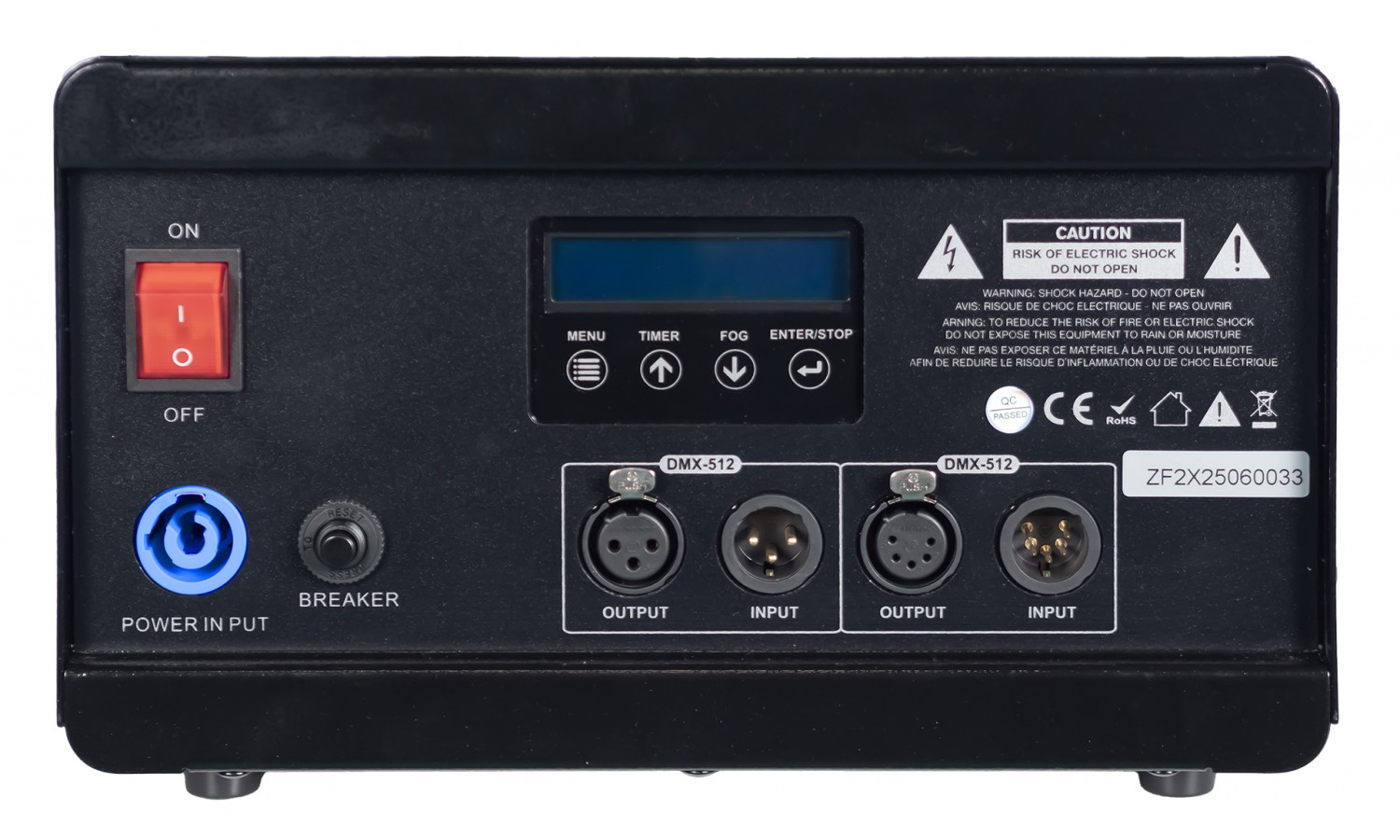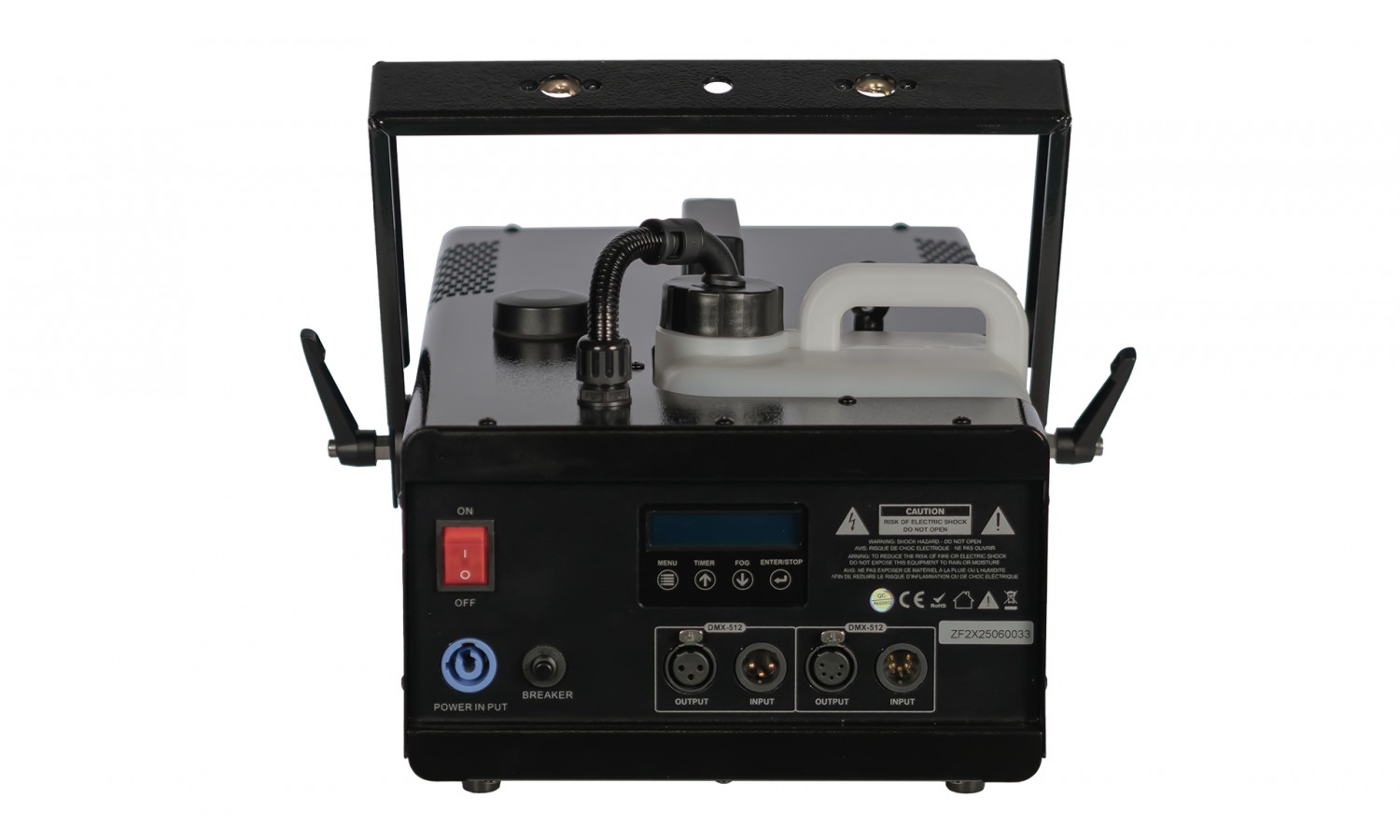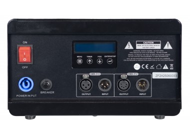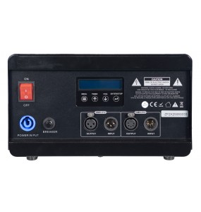 La macchina è dotata di connettori XLR a 3 pin e 5 pin per garantire massima compatibilità e di ingresso PowerCON TRUE. L'interruttore di accensione è illuminato per una facile individuazione, e il serbatoio del fluido è provvisto di controllo del livello con una chiara indicazione quando il serbatoio risulta vuoto.
