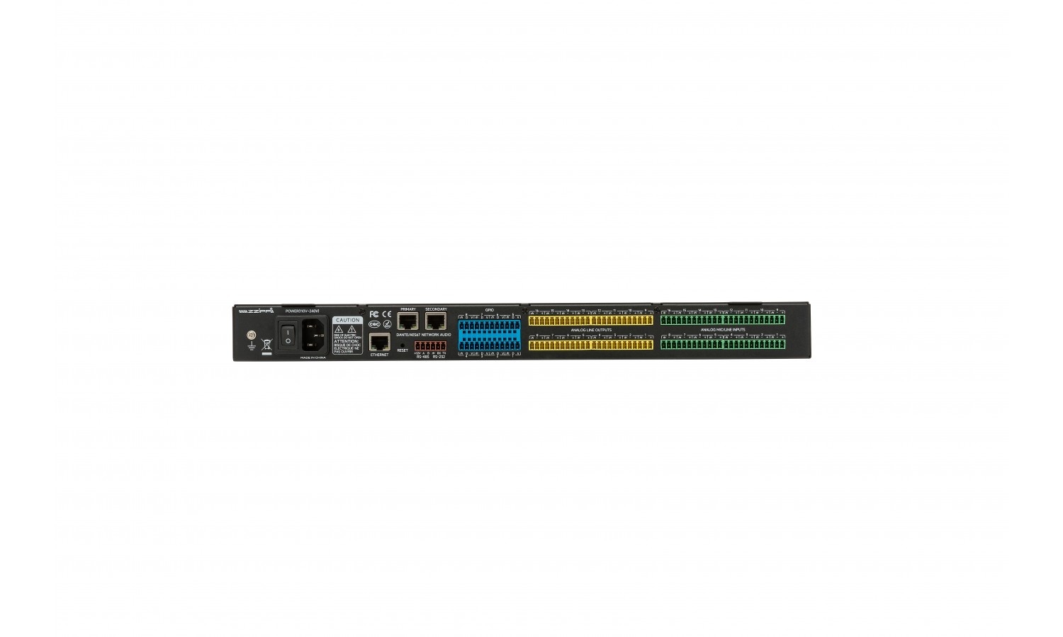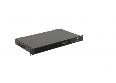 Supporta il protocollo Dante e la comunicazione con sistemi di terze parti tramite protocolli UDP, RS232 e RS485, consentendo la gestione del routing e del processing audio in tempo reale..