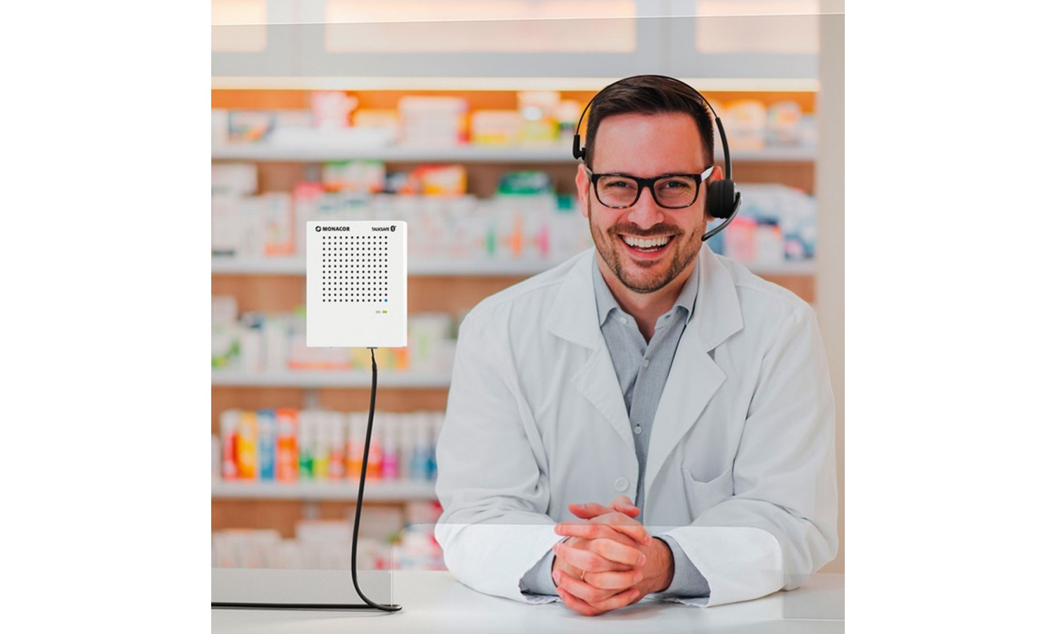 TALKSAFE-1 garantisce una comunicazione chiara e comprensibile alle casse, ai banchi informazioni, ecc. Nonostante la distanza di sicurezza, le pareti igieniche e le maschere facciali.